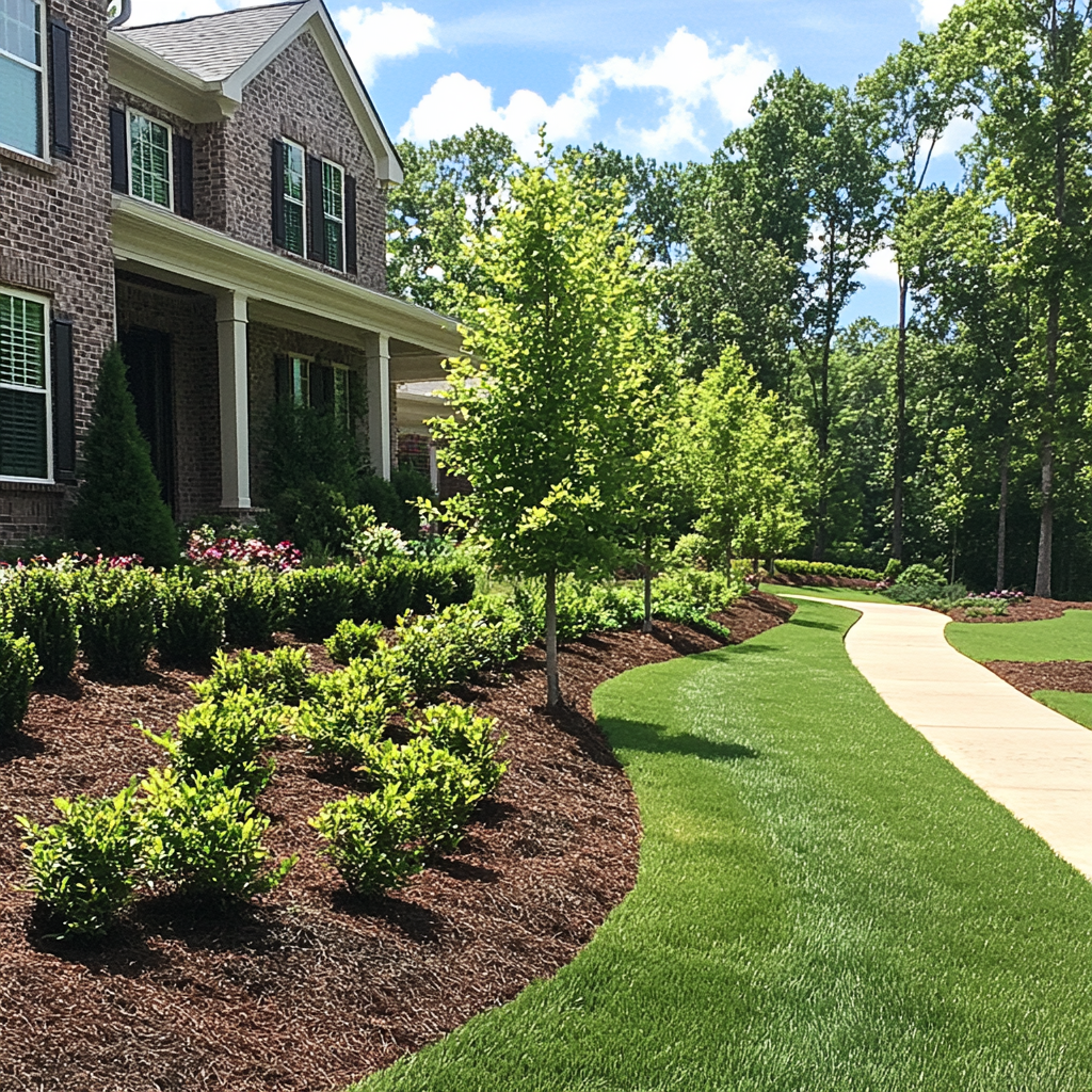 Popular mulch options for low-maintenance yards include bark mulch, pine needles, and wood chips, all of which are effective in North Carolina’s climate. Mulching not only improves the health of plants but also contributes to a neat and attractive yard, enhancing curb appeal in neighborhoods like Mint Hill and Ballantyne.